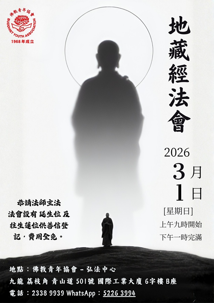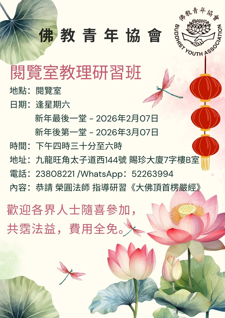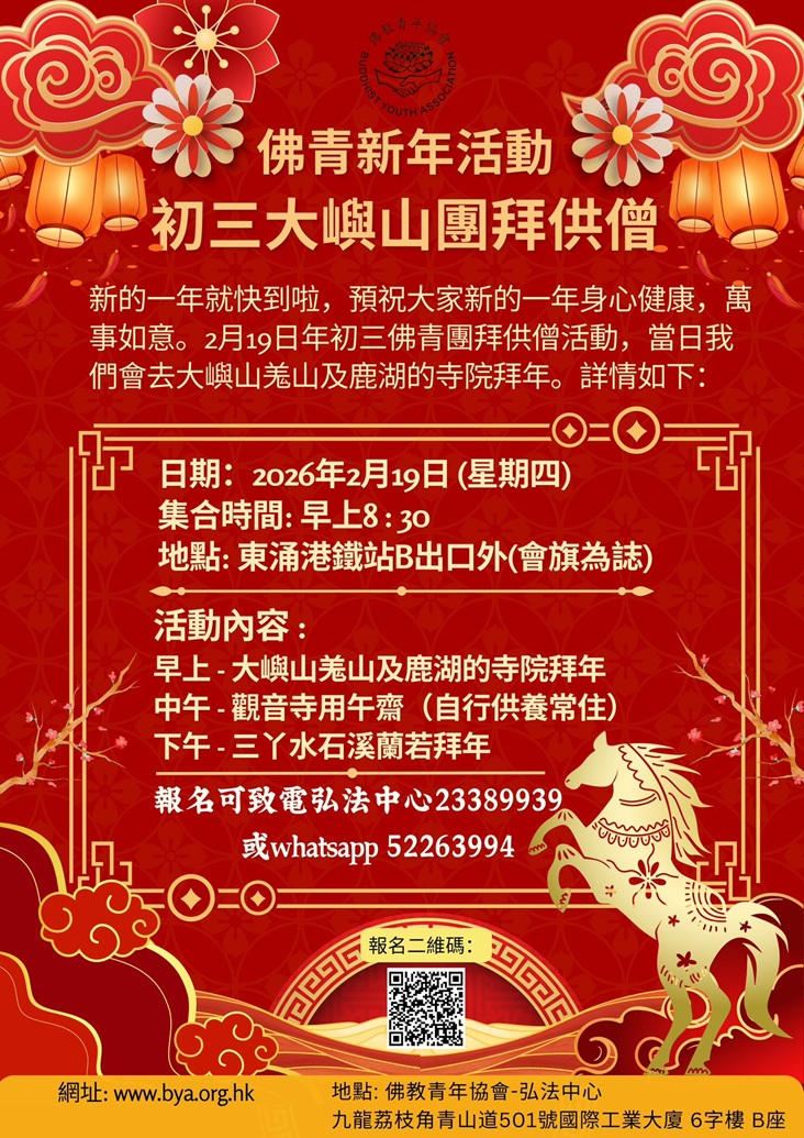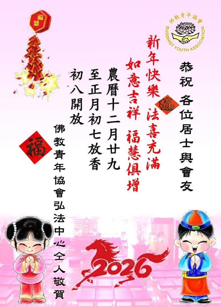 2026年2月9日(乙巳年農曆十二月廿二日)星期一至2月28日(丙午年農曆正月十二日)星期六,佛教青年協會弘法中心
