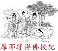 由此因緣故,燃燈佛說:「此摩那婆。過阿僧祇劫。當得作佛。號釋迦牟尼多陀阿伽度阿羅呵三藐三佛陀。十號具足。如我無異。」