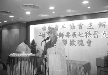 |    為恭賀暢懷法師七秩晉九壽辰,佛教青年協會於十一月二十三日(星期五)晚上七時正在九龍旺角新世紀中心美心酒樓設素宴,席間為荷石精舍籌建大雄寶殿義賣、拍賣等,利益人天。法師一生修學佛法,護持佛法,弘揚佛法,弘法利生無倦,道譽日隆,德澤廣被,善緣遍植,緇素道侶弟子遍海內外;是故當晚筵開一百零五席,千餘佛家弟子,高僧大德,居士善信,雲集一堂,齊杯祝願法師健康長壽,廣度眾生。弟子們祝法師長命百歲,萬壽無彊,可見賓客及弟子們景仰之忱,願法師長住在世。而法師臺上致詞時卻一再開示「諸惡莫作,眾善奉行,自淨其意,是諸佛教。」的道理。諄諄教誨,語重心長。一如既往,席間法師下座輪席答謝來賓厚意,親切平和;而來賓及弟子多人筵前獻歌,博得師父們及一眾席客不少掌聲,可謂滿堂歡樂,法喜充滿。   猶記起法師曾開示信眾說:「法師生日即眾生生日,出家人無所謂生日,不過藉此共聚一堂,恭敬三寶,而作佛事,弘揚佛法,增強團體活動,長養各人善功德,不得已而諾之矣。」法師以入世隨俗活動,弘揚出世的佛教精神,乃大乘行者也。值得後學敬佩!  當晚,法師隨緣開示信眾:「諸惡莫作,眾善奉行,自淨其意,是諸佛教。」出自『七佛通戒偈』,是佛法最根本的綱領;達蘭沙拉辯經學院院長格西壇確曾說:身(行為)、口(言語)、意(意念)不損惱一切眾生,是佛教徒最基本的戒律。如果這一點做不到,即使身披袈裟也不算是佛教徒。這是一個看似簡單卻非常嚴格的佛教徒定義。在佛法上,佛教徒身、口、意都不能損惱一切眾生,要諸惡莫作,眾善奉行,自淨其意。