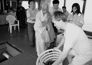 |   佛教青年協會於二零零八年五月十八日(星期日)租用一艘三層高渡輪及兩艘放生船於北大嶼山對出海峽放生多種海族,節目包括浴佛典禮、放生、抽獎、茶點等。參加者逾八百多人。放生海族共費港幣三十三萬八千八百八十元。                 參加浴佛船河放生的善信在九龍城碼頭(土瓜灣)集合,下午一時準時開船。浴佛開始前,先請 上暢下懷法師開示,之後,便進行浴佛儀式,唱過《爐香讚》後,開始用香花水灌沐太子佛。下層信眾先浴佛,跟著上層再順座位次序浴佛,秩序井然,待到八百多人都浴過佛,船已經來到北大嶼山對出海峽了。   兩艘放生船停定靠攏,三十多位穿著橙色耀目救生衣的大漢跳上放生船,手持撈網兩邊排開,上暢下懷法師及法器組義工們魚貫而下。放生船停定後便開始誦經、持咒。之後 上暢下懷法師於佛前置楊枝、水盂,捻香、燃燈,種種供養。然後以慈悲心,視所放眾生,念其沉淪,深生哀憫。復念三寶有大威力,能救拔之。法師一心奉請大慈大悲觀世音菩薩,降臨道場,加持此水,具大功勳,沾此灑所放眾生,令彼身心清淨,堪聞妙法。法師隨即用楊枝淨水遍灑魚兒水族,為說三皈依,便在佛號聲中放生,義工們使勁地將魚撈出,投入大海,有人抱著大魚拍照留念,「同生今世亦前緣,共坐一船因善修,今日放汝歸將去,龍宮淨土好居留」。今次放生三十三萬八千八百八十元,魚類水族不少,例如有石班、沙蜆、鑽石螺、百花鱸魚、油追……等等。  祝願所放魚類、眾生,既放之後。永不遭惡魔吞瞰。永不遭網捕相加。獲盡天年。命終之後。承三寶威德之力。隨願往生。持戒修行。授菩薩記。得大解脫。證無上菩提。更願報名放生弟子眾善信人等。菩提行願。念念增明。救護眾生。常如己想。得生安養。見阿彌陀佛。證無生忍。分身塵剎。盡未來際。廣度眾生。並願捕生人等。回心相善。同得解脫。共證真常。